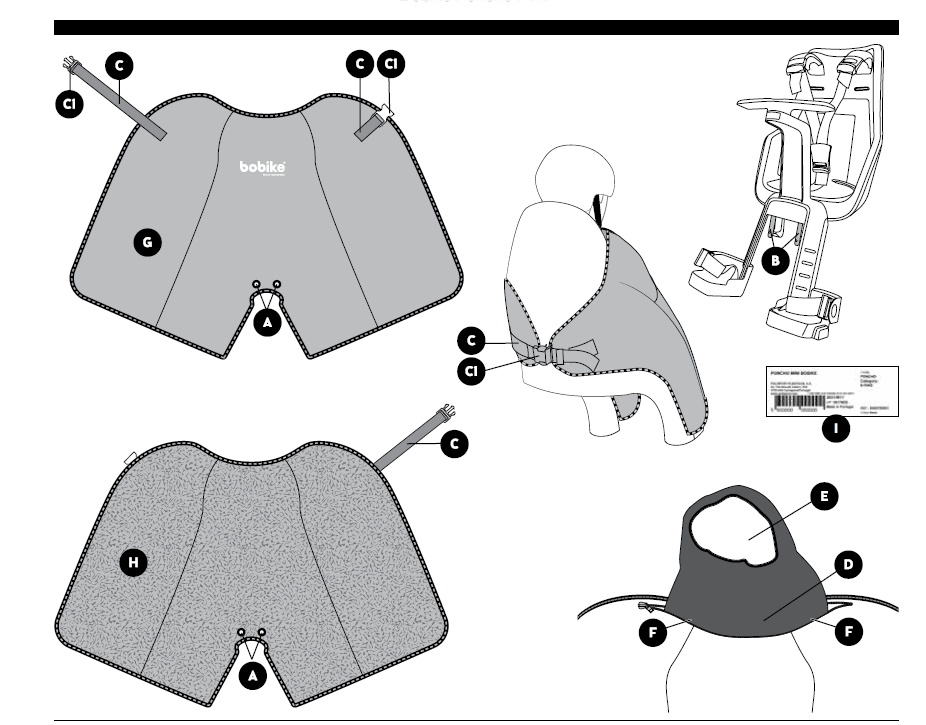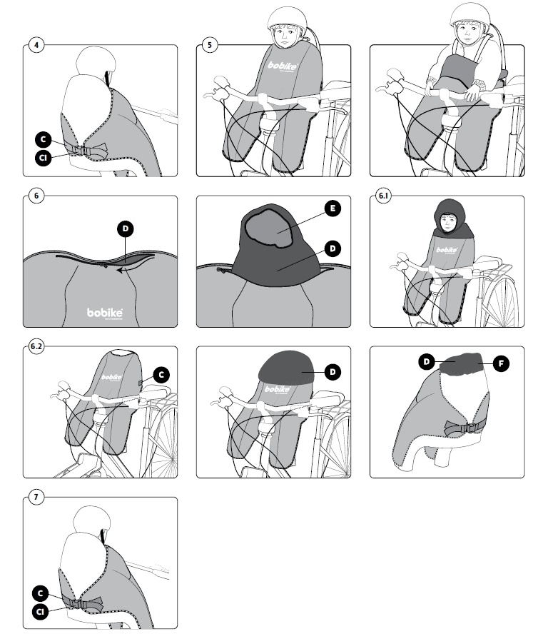 When it’s raining or snowing, you can protect the inside of BOBIKE PONCHO and the seat using the rain seat cover (D). Extract the cape (D), wrap it around the backrest of the seat, then close the rain seat cover buttons (F) to tighten the cape (D) around the edges of the backrest. Fold the rain cover hood (E)