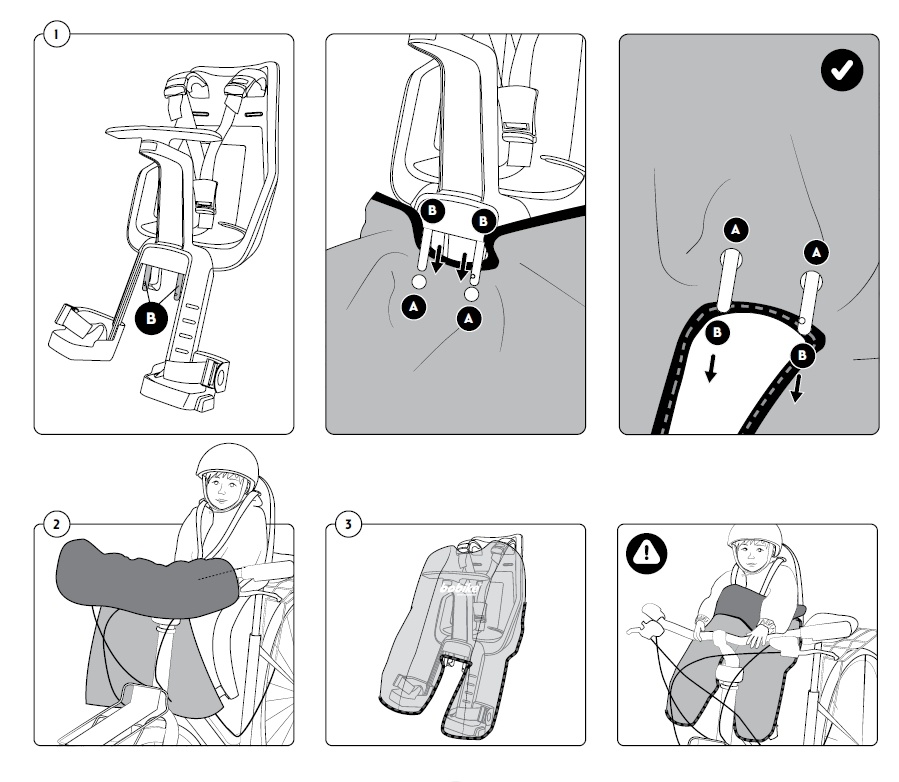 Voor de montage van het fietszitje en de Poncho op de fiets steekt u de twee uiteinden van de stalen stang (B) in de daarvoor bestemde openingen in de montagehouder. Wanneer u dit heeft gedaan, zult u een lichte “klik” horen.